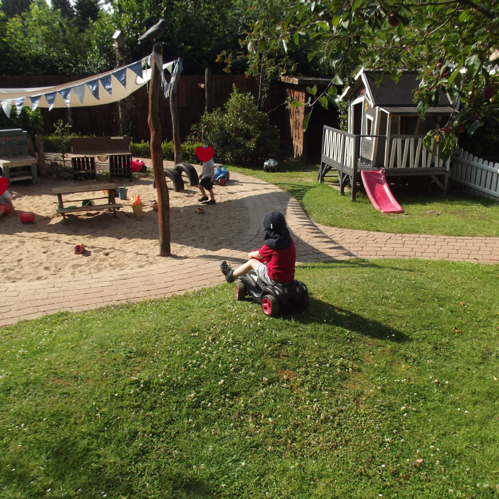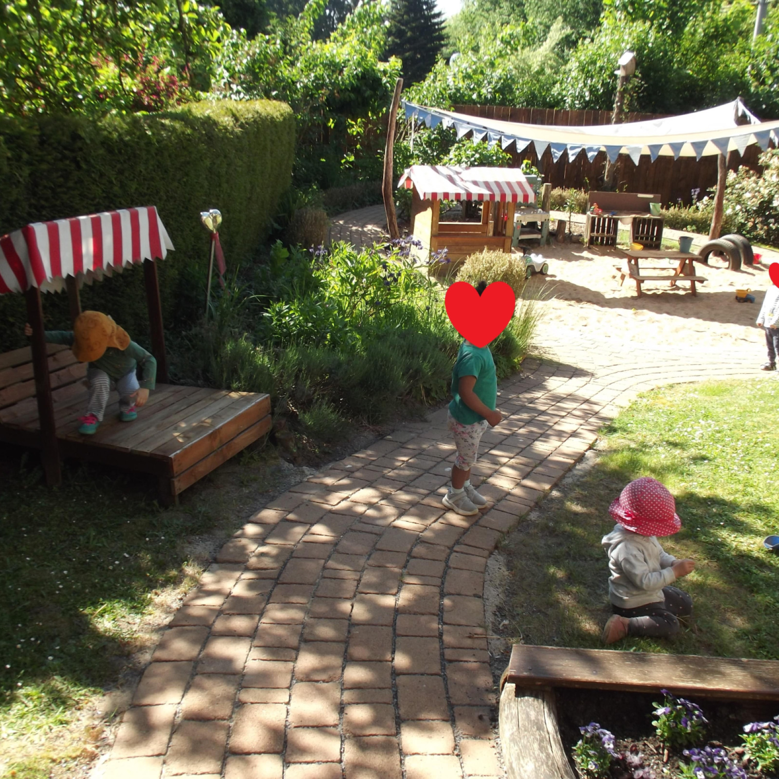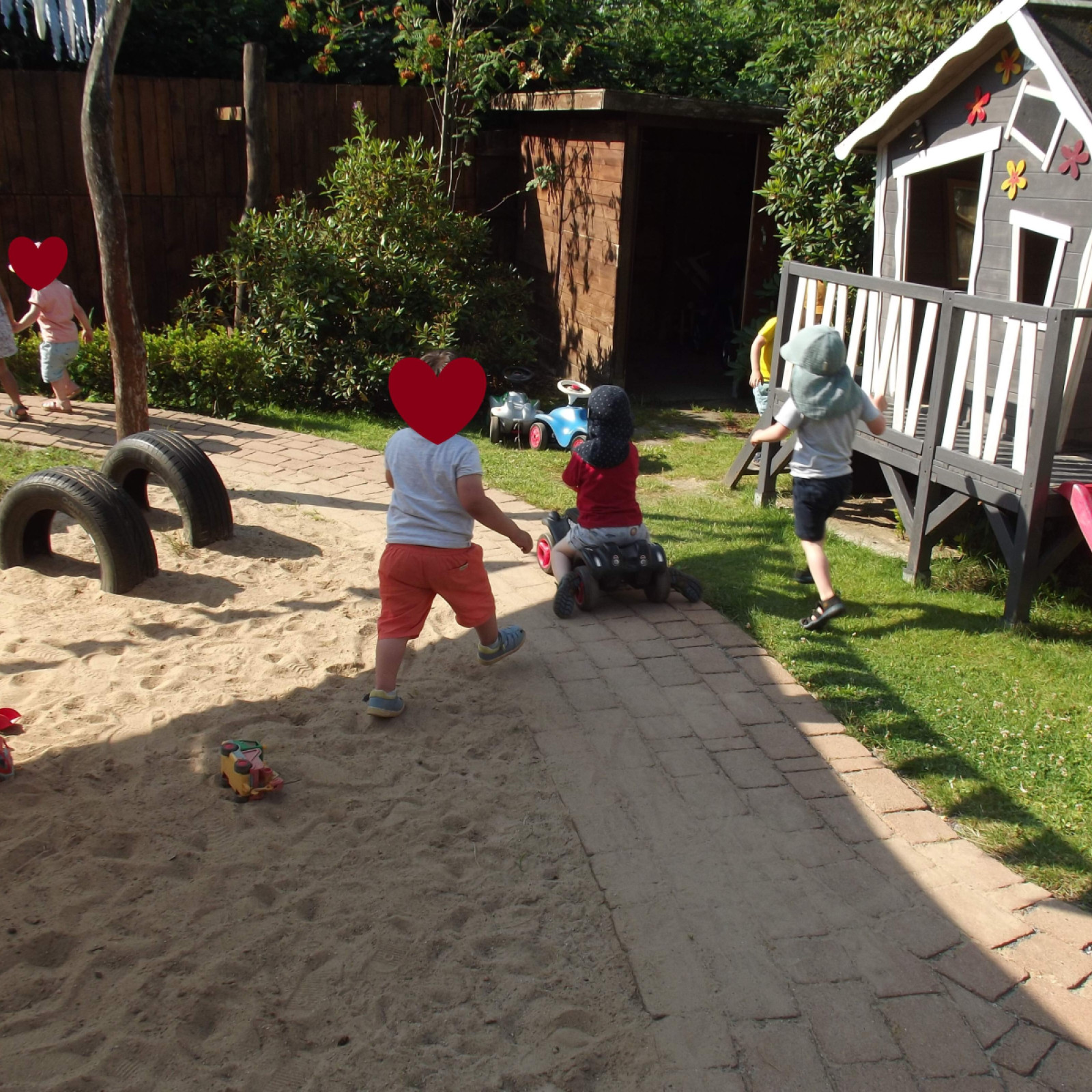 In unserem eigenen kindgerecht gestaltetem Garten haben die Kinder viele Möglichkeiten sich auszuleben. Sie können im Sand spielen und matschen, Bobbycar fahren und auf Hüpfepferdchen reiten, rennen, toben und Verstecken spielen, die Natur entdecken oder im Garten nebenan die freilaufenden Hühner unseres Vermieters beobachten. Gemeinsam beobachten wir unser Obst und Gemüse in unseren Hochbeeten beim Wachsen, pflegen und versorgen es, bevor wir dann gemeinsam ernten und es uns schmecken lassen.