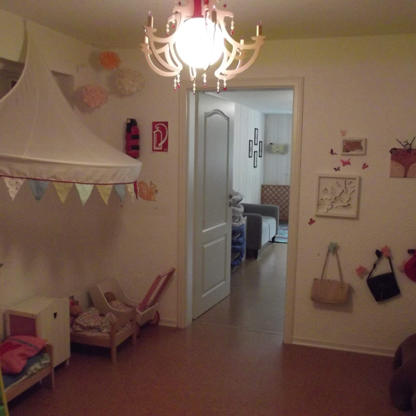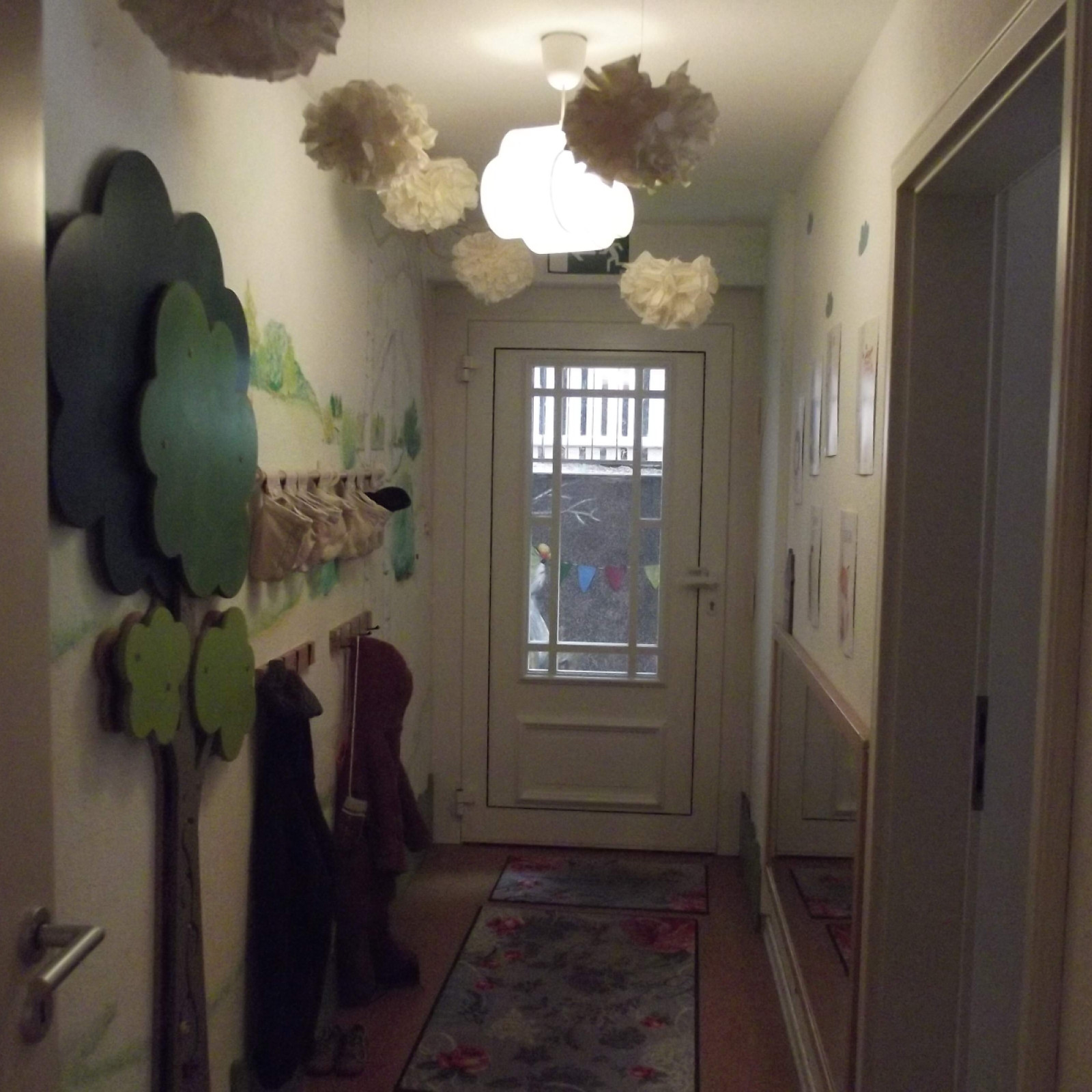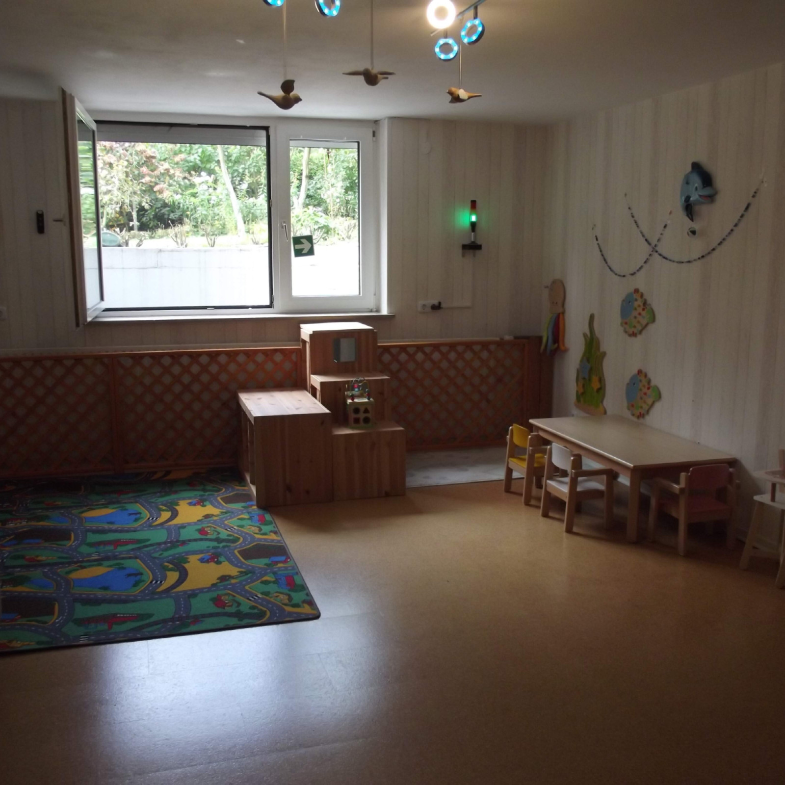 Kinder haben besondere Bedürfnisse an die Einrichtung: der Waschbereich hat einen Wickeltisch, niedrige Waschbecken und eine Toilette. Für den Mittagsschlaf gibt es für jedes Kind ein eigenes weich gepolstertes Kinderschlafkörbchen mit einem flachen Kissen und einer weichen Decke. Die Küche ist besonders wichtig: hier bereiten wir – zum Teil auch gemeinsam mit den Kindern – die Mahlzeiten zu und lassen es uns zusammen am großen Tisch schmecken. Den großen Tisch nutzen wir auch zum Malen und Basteln. In den Räumen gibt es verschiedene Bereiche zum Klettern, Bauen, Kuscheln, Bücher lesen oder Spielen.
