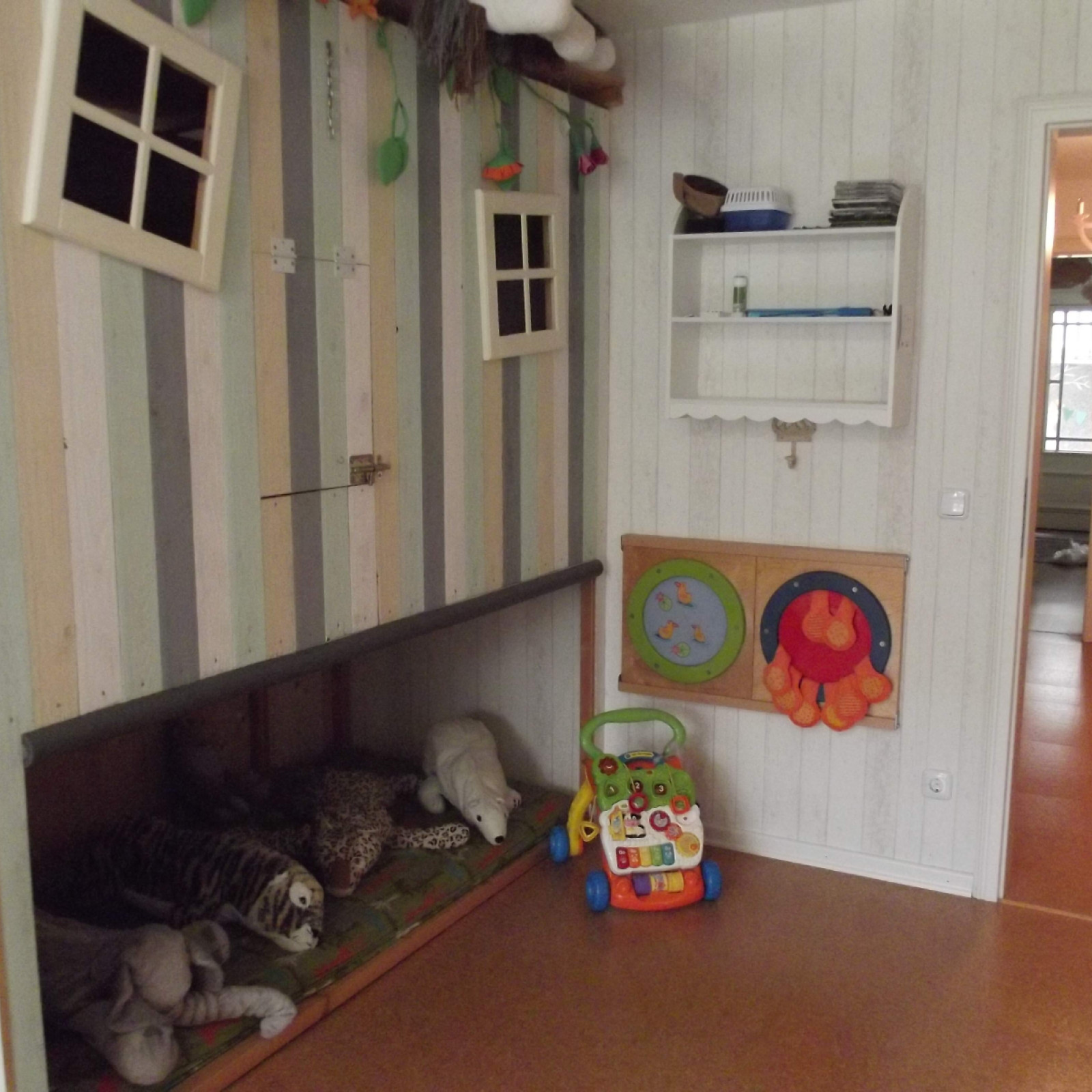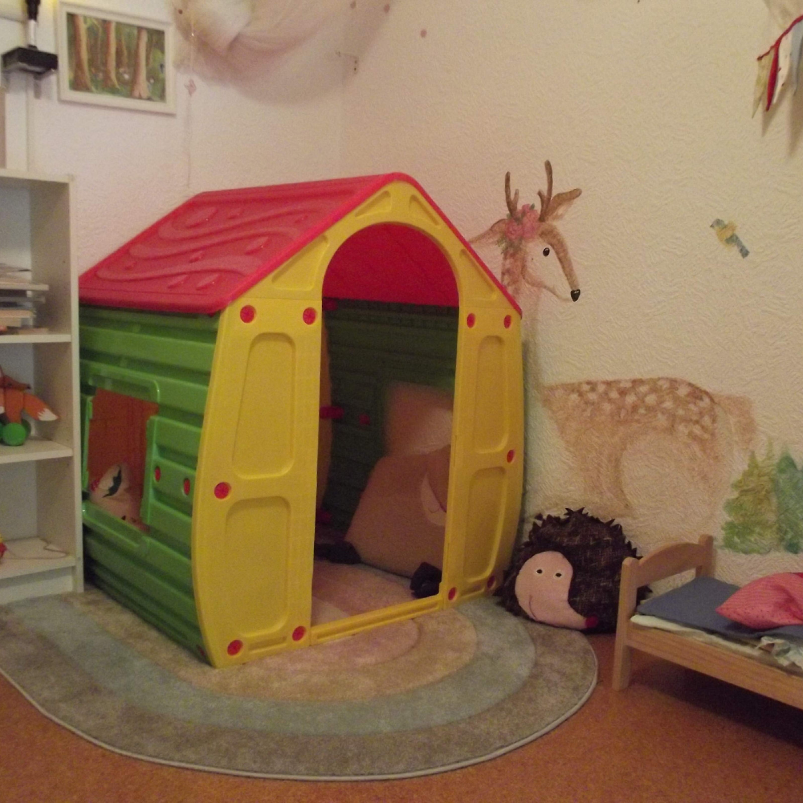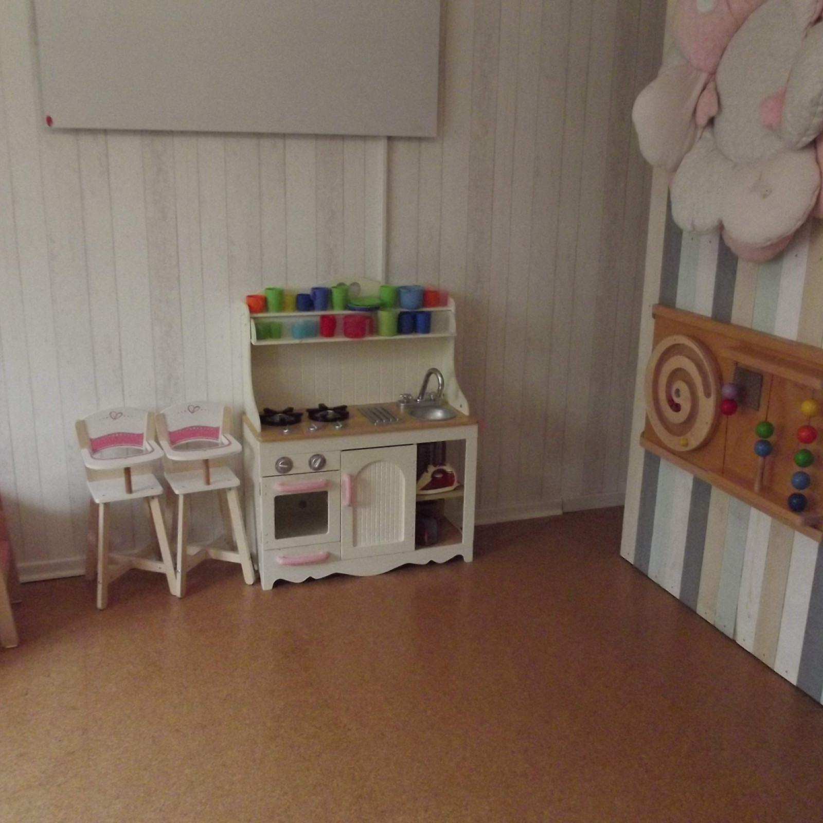 Kinder haben besondere Bedürfnisse an die Einrichtung: der Waschbereich hat einen Wickeltisch, niedrige Waschbecken und eine Toilette. Für den Mittagsschlaf gibt es für jedes Kind ein eigenes weich gepolstertes Kinderschlafkörbchen mit einem flachen Kissen und einer weichen Decke. Die Küche ist besonders wichtig: hier bereiten wir – zum Teil auch gemeinsam mit den Kindern – die Mahlzeiten zu und lassen es uns zusammen am großen Tisch schmecken. Den großen Tisch nutzen wir auch zum Malen und Basteln. In den Räumen gibt es verschiedene Bereiche zum Klettern, Bauen, Kuscheln, Bücher lesen oder Spielen.